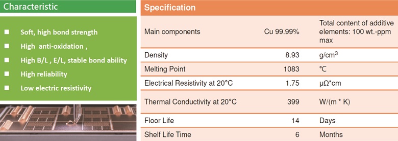 • Appropriate doping added that enable high operation temp (250C), consistent bonding wire curvature and bonding strength (pull and shear) against pure copper wire.