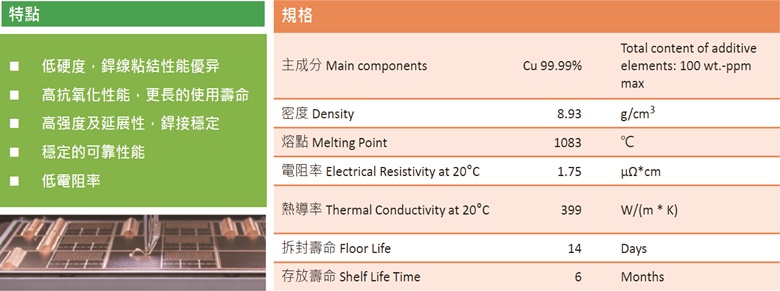 • 我們嚴選添加微量元素,于高電壓産品在可靠性方面,對比傳統粗銅線有更理想的表現。此外,除了在操作溫度能承受高達250℃外,其銲接後線弧穩定達成一致,對推拉力同樣能呈現穩定表現。